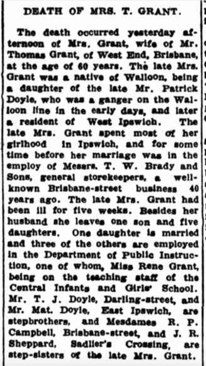 Margaret Jane (nee Doyle) and Thomas Henry Grant lived their final years (early 1930's) in 170 Boundary St. West End, Brisbane. The two single photos of them are the images that always hung in large frames in their daughter Bernie’s bedroom.