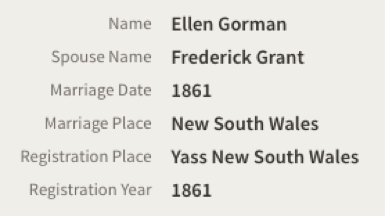 When I then searched for a marriage of a Frederick Grant and an Ellen Gorman I quickly found a NSW record.