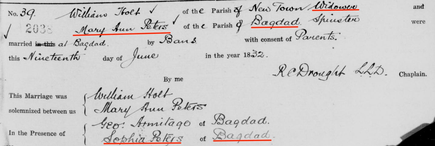It would seem very likely that Mary Ann Holt (nee Peters) is one of the eight children reported to have been born to Thomas Peters and Mary Ann [Ann] Peters (nee Hews) and that the entry of her mother’s maiden name as Warrick is an error.