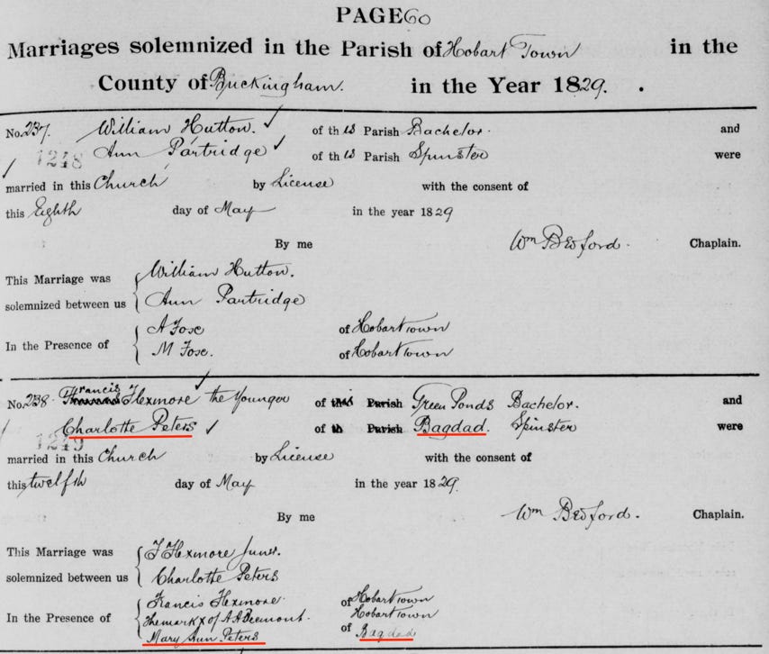 Charlotte Peters 1806–1869 (Mary Ann is a witness at her marriage in 1829 to Francis Flexmore Jnr). SEE Image below.