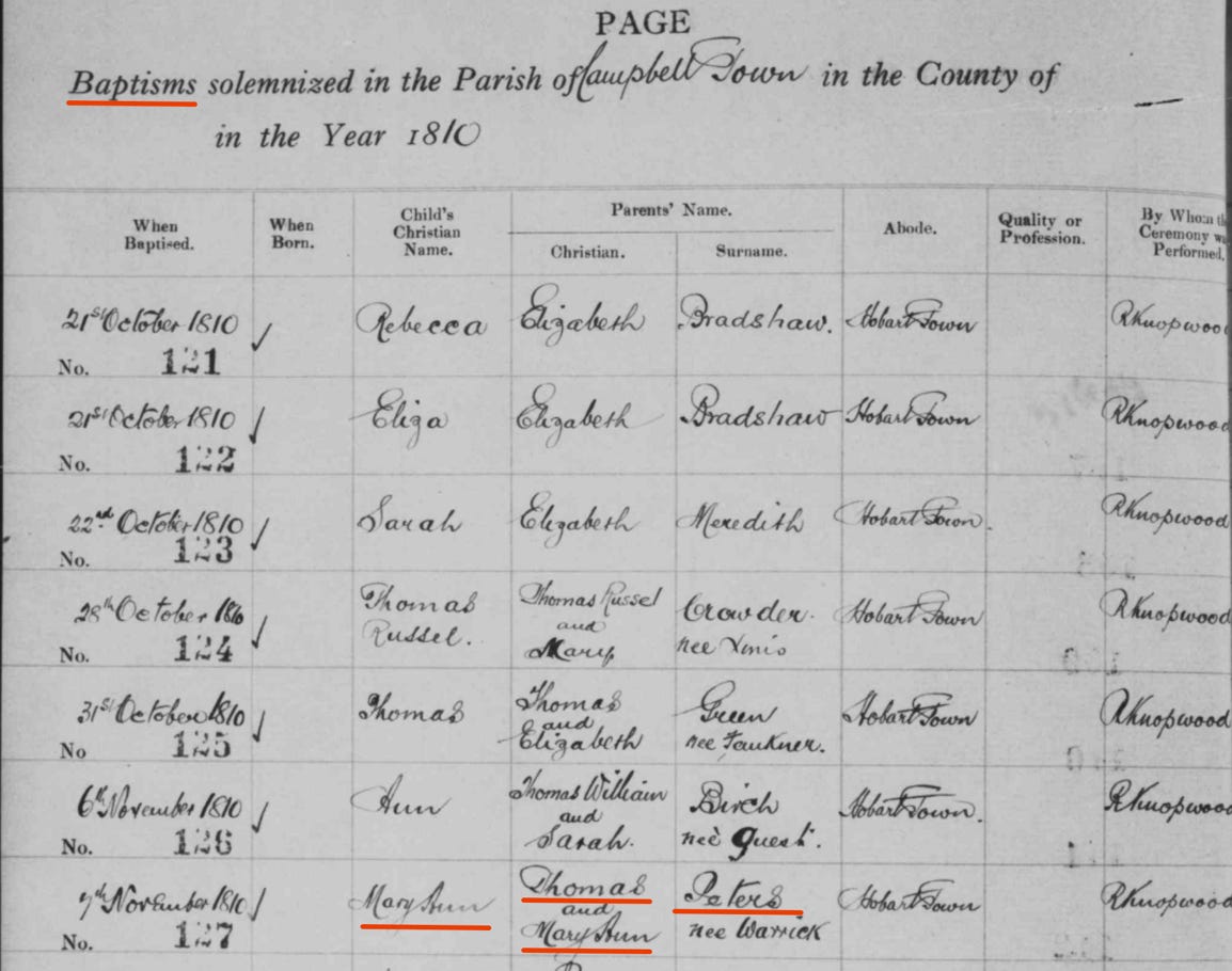 Mary Ann Peters was born in Hobart Town in 1810, and baptised by Rev. Robert Knopwood on 7th November 1810. The baptismal record shows her parents to be Thomas Peters and Mary Ann Peters (nee Warrick).