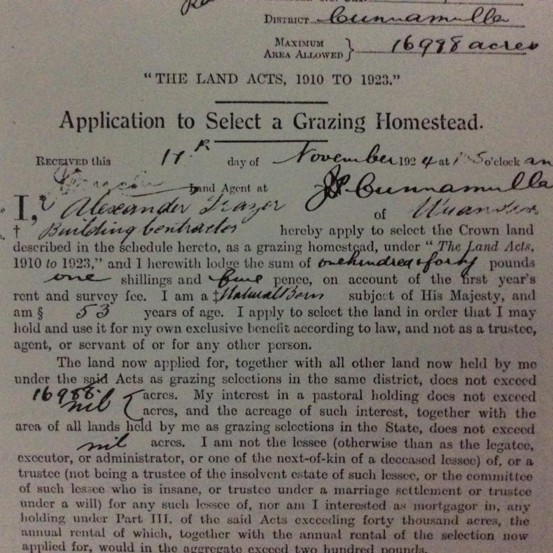 My great-grandfather Alexander Frazer selected the land that was to become known as Werona on 17th November 1924. By the start of the 1930’s he and his wife Agnes Jane (nee Stewart), and their daughter Alma, had established a homestead on the property. At this time his daughter Grace then moved from Wyandra to live with them.