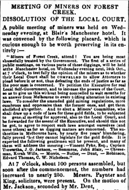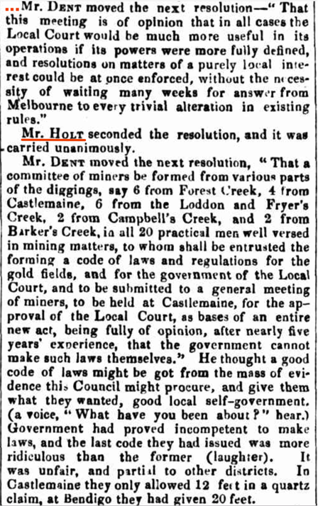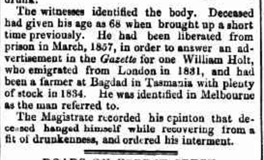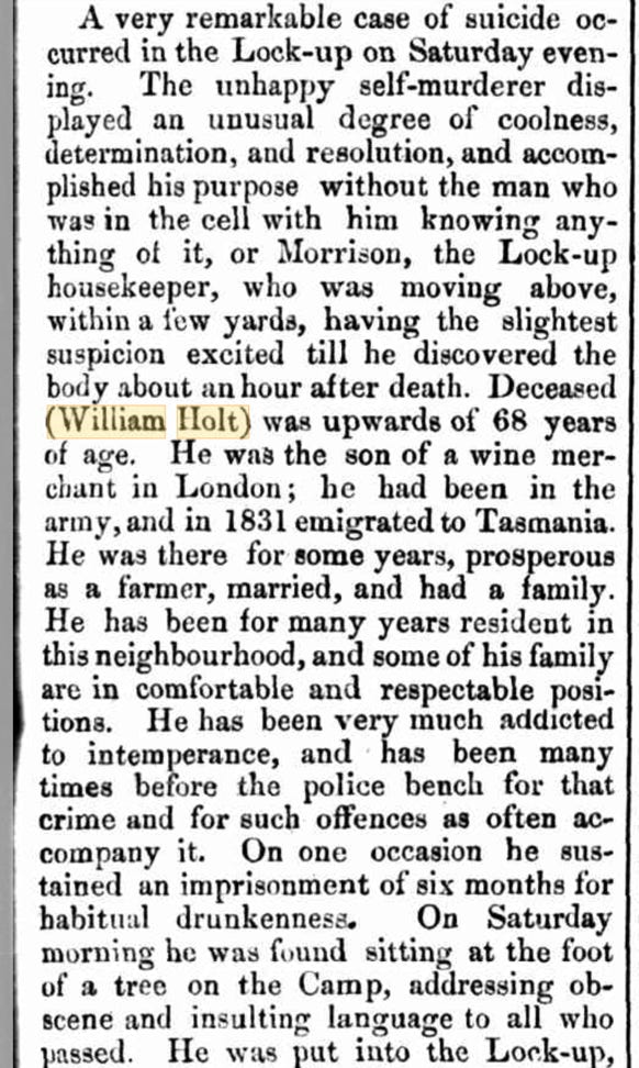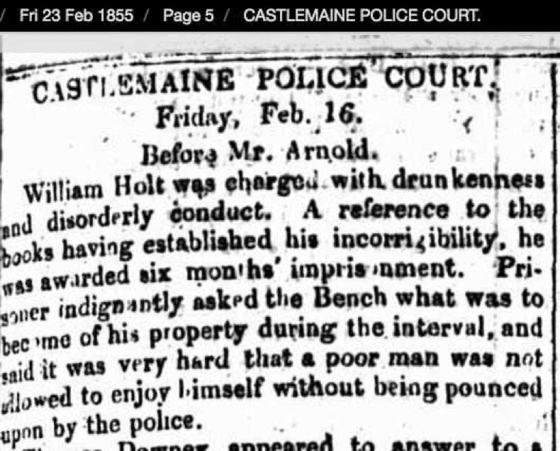The next group of records that definitely pertain to ‘William Holt of Bagdad’ have him located at Castlemaine, Victoria in the 1850s. On 20 July 1851 gold was discovered near present-day Castlemaine (Mt Alexander Goldfields). The Forest Creek diggings became the world’s richest ever shallow alluvial goldfield. The attraction of gold at Forest Creek led to a huge influx of gold-seekers. Once again there is more than one ‘Mr Holt’ living in this region in the 1850s. However the detailed accounts of the death by suicide of ‘William Holt of Bagdad’ on 3rd April 1858 makes it possible to identify him as being the William Holt who was sentenced three years earlier, in Castlemaine Police Court, to six months imprisonment. He may or may not have been the Mr Holt who is mentioned in the report on the meeting of miners in October 1855, but it is almost certain that ‘William Holt of Bagdad’ would have come to Castlemaine in the early 1850s because of the gold rush.