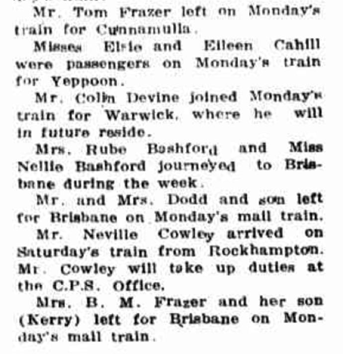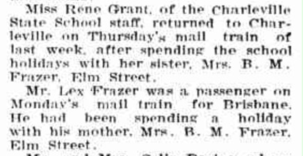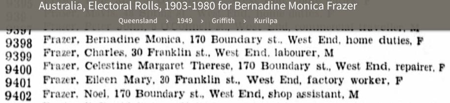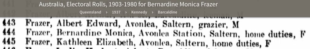 After her husband Sonny’s sudden death in 1936 Bernadine Frazer remained living on the Avonslea property with her children for a couple of years. By 1940 she had moved her family into a house in Elm St. Barcaldine. Notes in The Longreach Leader record some of the visits she had from her sister Rene, her sons Lex and Tom, and her nephew ‘Bryan’ Grant (the son of her only brother, Douglas). They also record her trip to Brisbane with her son Kerry. In 1947 Avonslea was sold, and by 1949 Bernadine had moved to 170 Boundary St. West End, Brisbane.
