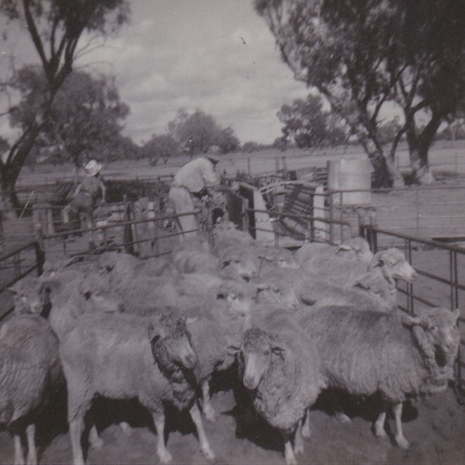 The working life on Werona was centred around the annual sheep husbandry activities: shearing, dipping, crutching, lamb marking and ear tagging. From when we were quite young we all had some helping role to play. Most tasks required that the mobs of sheep be mustered and brought to the yards adjoining the wool shed. When we weren’t old enough for the full day of mustering on horseback we kept an afternoon lookout from the back of the house for the incoming sheep. We were then allowed to ride out to help pen them up.