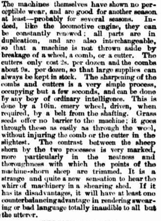 “Wool production was helped by a mechanical sheep shearing machine, invented by Frederick Wolseley (1837–99) when it was demonstrated around the country – to the delight of woolgrowers and the horror of blade shearers in the mid-1880s”