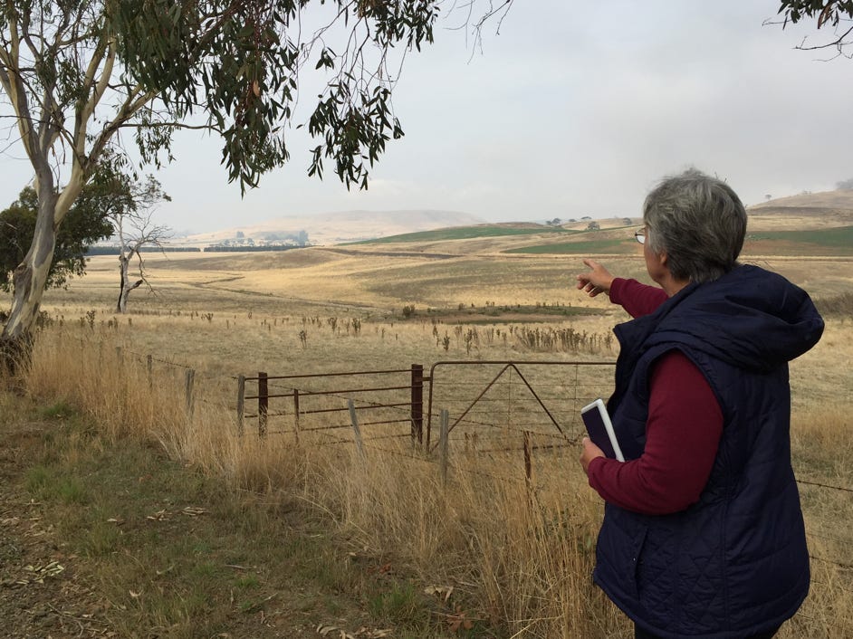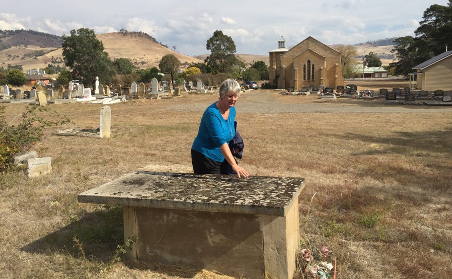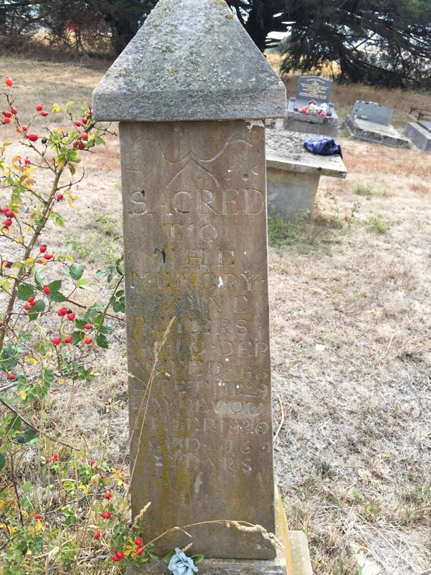200 years ago... In January 1817 Thomas Peters was granted 100 acres of land. It was located on both sides of the 1876 railway line that I am pointing to. I am standing beside Sorrel Springs Rd. where it bends very close to the rivulet end of his land. The Peters property stretched South from Tin Dish Rivulet to the line of trees that can be seen in the distance. See: https://www.google.com.au/maps/place/Tin+Dish+Rivulet/@-42.2464146,147.4377009,1003m/data=!3m1!1e3!4m5!3m4!1s0xaa71c248ab030e2d:0x615e77d179a88d2e!8m2!3d-42.2714172!4d147.4465276
