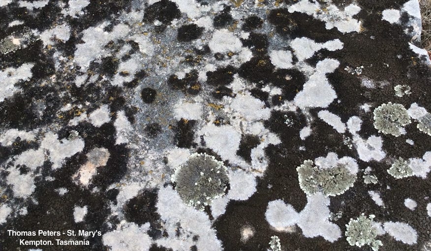 been lost amidst the beautiful lawn and trees in St David’s Park, Hobart. Thomas died twenty years later, but the inscription on his tomb at St Mary’s Anglican Church in Kempton is now nearly completely obscured by lichens. It faintly reads: