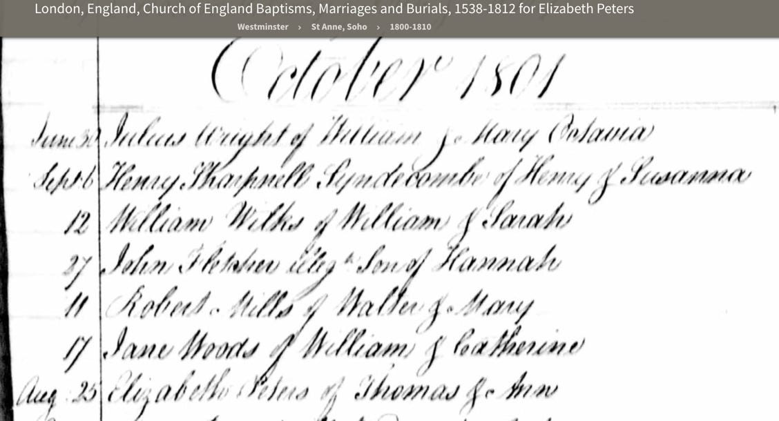 Thomas Peters and his wife Mary Ann (Ann) had a daughter, Elizabeth, who was born on 25th August 1801. (She was baptised on 7th October 1801.) When Elizabeth Peters was just 20 months old, she and her parents set sail for Australia aboard the prison ship Calcutta.