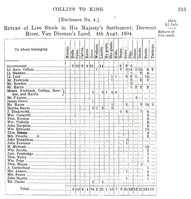 The Return of Live Stock in the Derwent River settlement for 4th August 1804 shows that Thomas Peters owned 4 fowls.