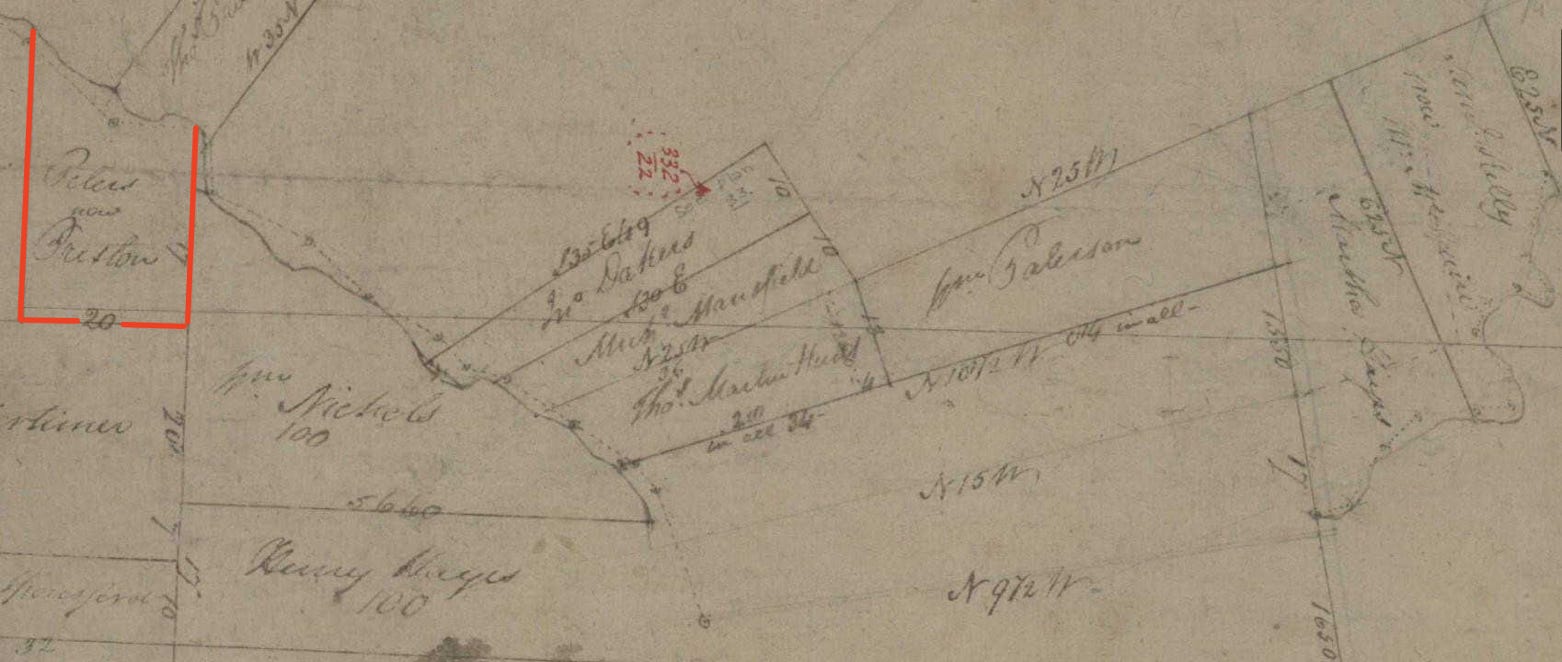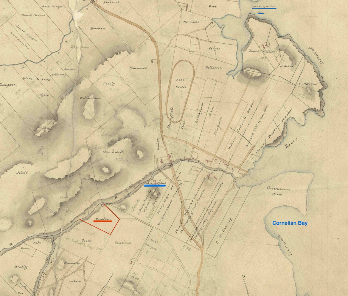 The Peters farm was taken up by Preston, as shown in this image which is detail from: