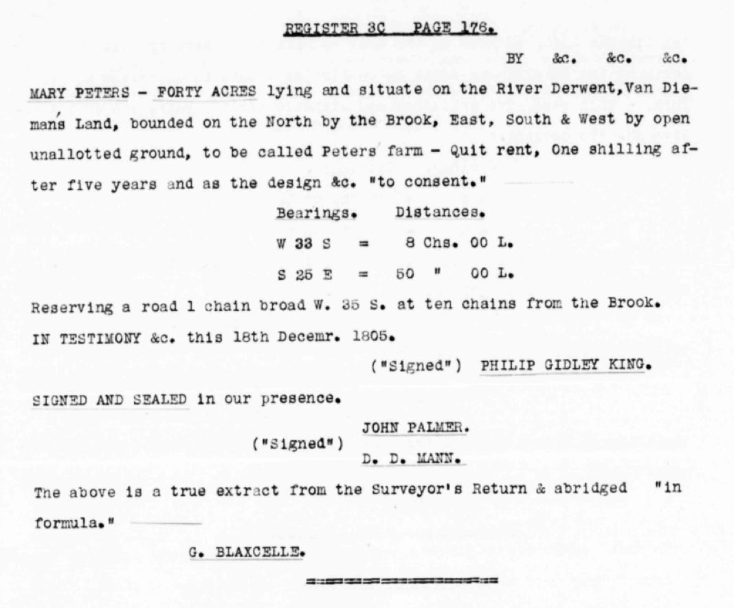…”The first land grants for Van Diemen’s Land were signed by Governor King on 15 August 1804. Four grants, each of 100 acres were made… In 1805 thirteen grants were issued: these again were 100-acre allotments, except for two smaller grants of 40 and 50 acres respectively to Mary Peters and Martha Hayes. The farms extended along the Derwent River.” - Sharon Morgan, Land Settlement in Early Tasmania: Creating an Antipodean England (Cambridge University Press, Cambridge, 1992), 10.