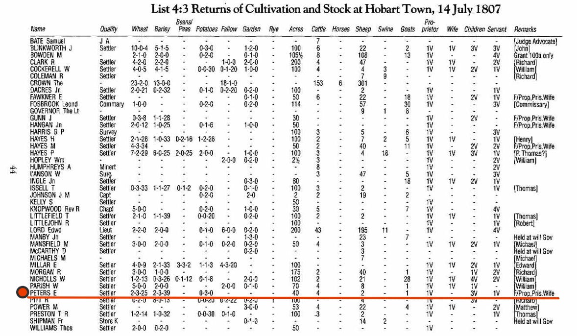 In Oct 1806 the 40 acre Peters farm was recorded as having three acres of wheat and half an acre of potatoes under cultivation, but they had no livestock. The farm is listed under E. Peters however Elizabeth at that time was only 5 yrs old. The land had been granted to her mother.