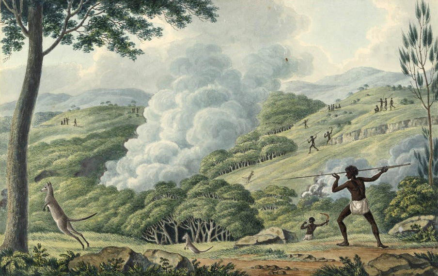 Aborigines Using Fire to Hunt Kangaroos, by Joseph Lycett. c. 1817