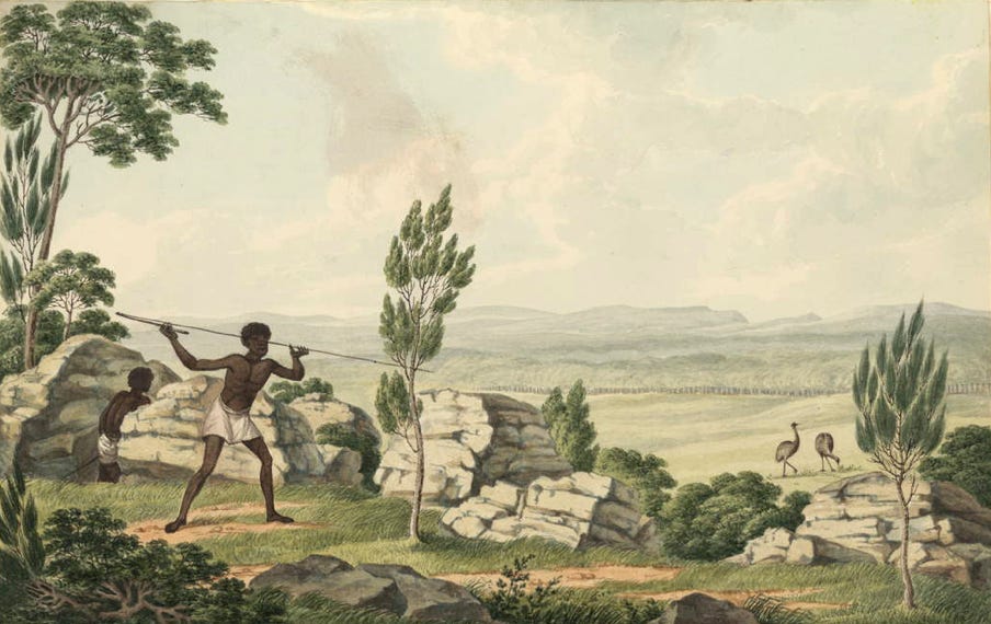 Two Aborigines Hunting Emus, by Joseph Lycett. c. 1817