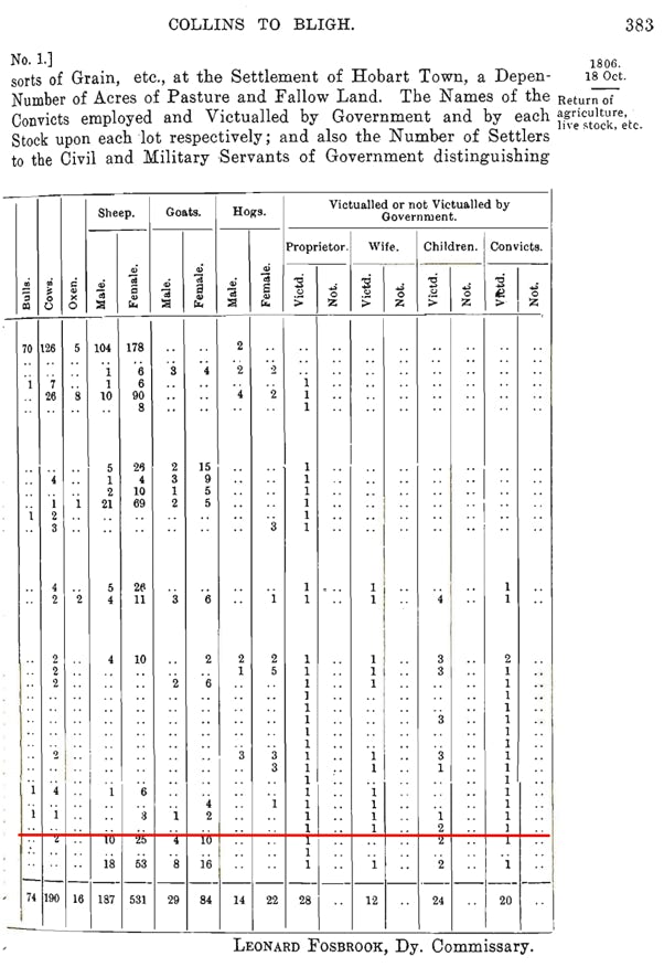 13th October 1806 …”at 5 went out afishing at 11 engaged upon business I Xnd Mrs Sargents child and took lunch at Mr. Bowdens. Waited upon the Govnr the day very fine, It is truly lamentable to see the distress that the people are in not a Man able to do any work, what few there are employd in unloading the King George the Lt Govnr is obliged to give them Pork and beef 4 lbs a man, all our Poultry are dying having nothing to give them the pOOl' Piggs &c &c are all dying and at this Season we should have young ducks and Chickings My poor pigeons are all most dead for want of Provisions only 4 remaining out of 16”. https://eprints.utas.edu.au/13550/1/1946-knopwood-diaries%5b1%5d.pdf