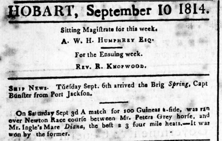 …”Early racing consisted of one-against-one challenges, using horses not bred for racing. The first recorded race took place in 1813 at a course at New Town, when John Ingle raced his grey mare Whyena against the Hobart paymaster's black filly Sally for the best of three 2-mile heats, the loser to pay the winner 20 guineas. Such races became popular in both Hobart and Launceston, and developed as thoroughbreds for racing were imported from England from the 1820s.” http://www.utas.edu.au/library/companion_to_tasmanian_history/H/Horseracing.htm