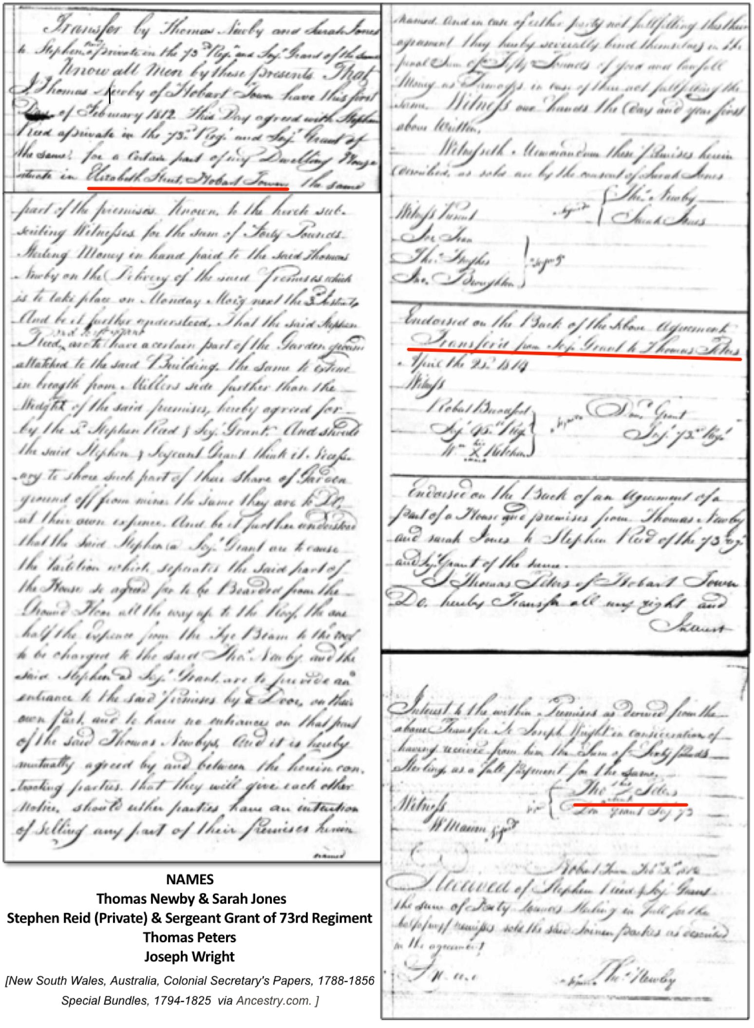 Thomas Peters is named in a document for the ‘Re-assignment of Land in Van Diemen’s Land’. On 3rd February 1812 an agreement is made between Thomas Newby and Sarah Jones, for part use of a dwelling house and property in Elizabeth St. Hobart Town to be assigned to Private Stephen Reid and Sergeant Grant of the 73 regiment. This use is transferred from Sergeant Grant to Thomas Peters on 26th April 1814, and Peters then transfers his interests to Joseph Wright. (New South Wales, Australia, Colonial Secretary's Papers, 1788-1856 Series: NRS 898; Reel or Fiche Numbers: Reels 6020-6040, 6070; Fiche 3260-3312 via Ancestry.com)