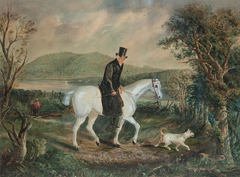 Painting of Reverend Robert Knopwood (1763-1838). Attributed to multiple artists: landscape by Frank Dunnett, parson by TG Gregson, pony and dog by JW Graves junior. Courtesy: St David's Cathedral, Hobart. via Wikimedia Commons