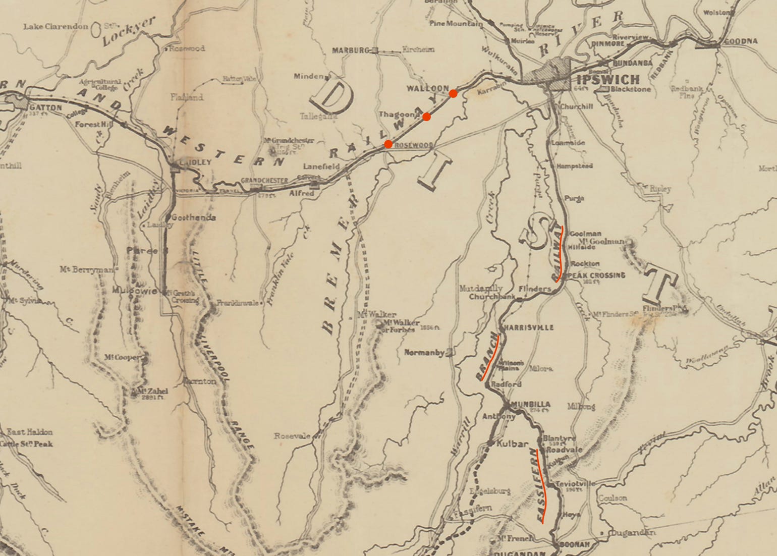 Thagoona was also on the first section of railway but a station was not obtained until 1881.”