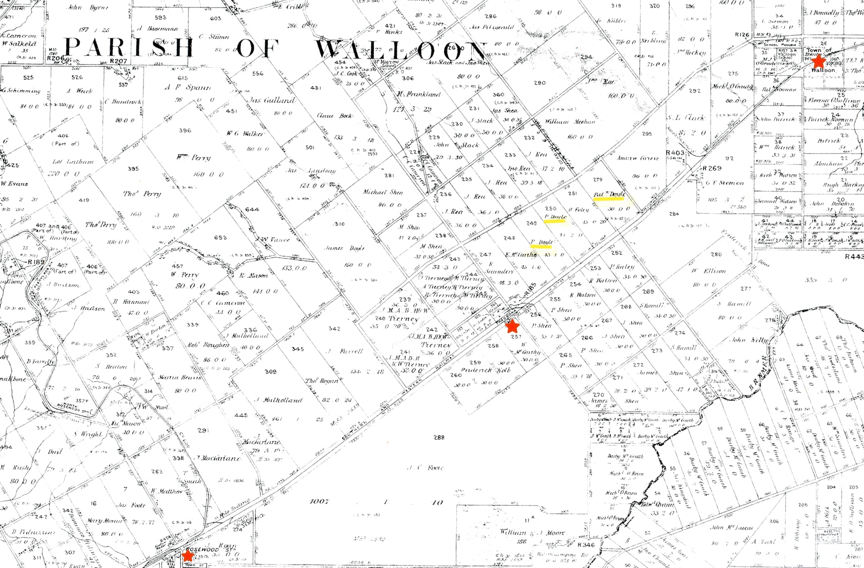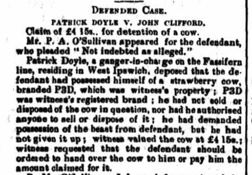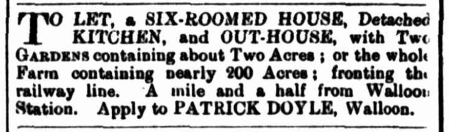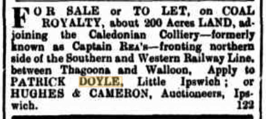 The Doyle's farm between Walloon and Thagoona had a railway frontage. In 1888 Patrick Doyle was a ganger-in-charge on the Fassifern line.