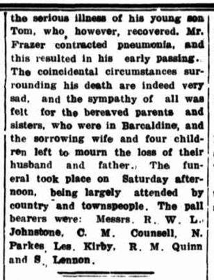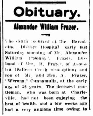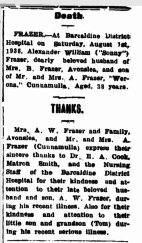 My father’s alcoholism wrought great havoc within my family, and it led to his early death. As a child I was very aware that nobody but my mother was prepared to speak in any detail of the circumstances of the death of my grandfather, Alexander William (“Sonny”) Frazer. …“The story is that when your father was thirteen he was seriously ill in Barcaldine Hospital with suspected meningitis. His father worked hard during the day and sat beside his bedside at the hospital at night. The day your father left the hospital his father was admitted, and he died within days.”
