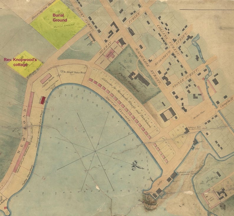I have highlighted the St. Davids burial ground & Rev. Knopwood’s cottage