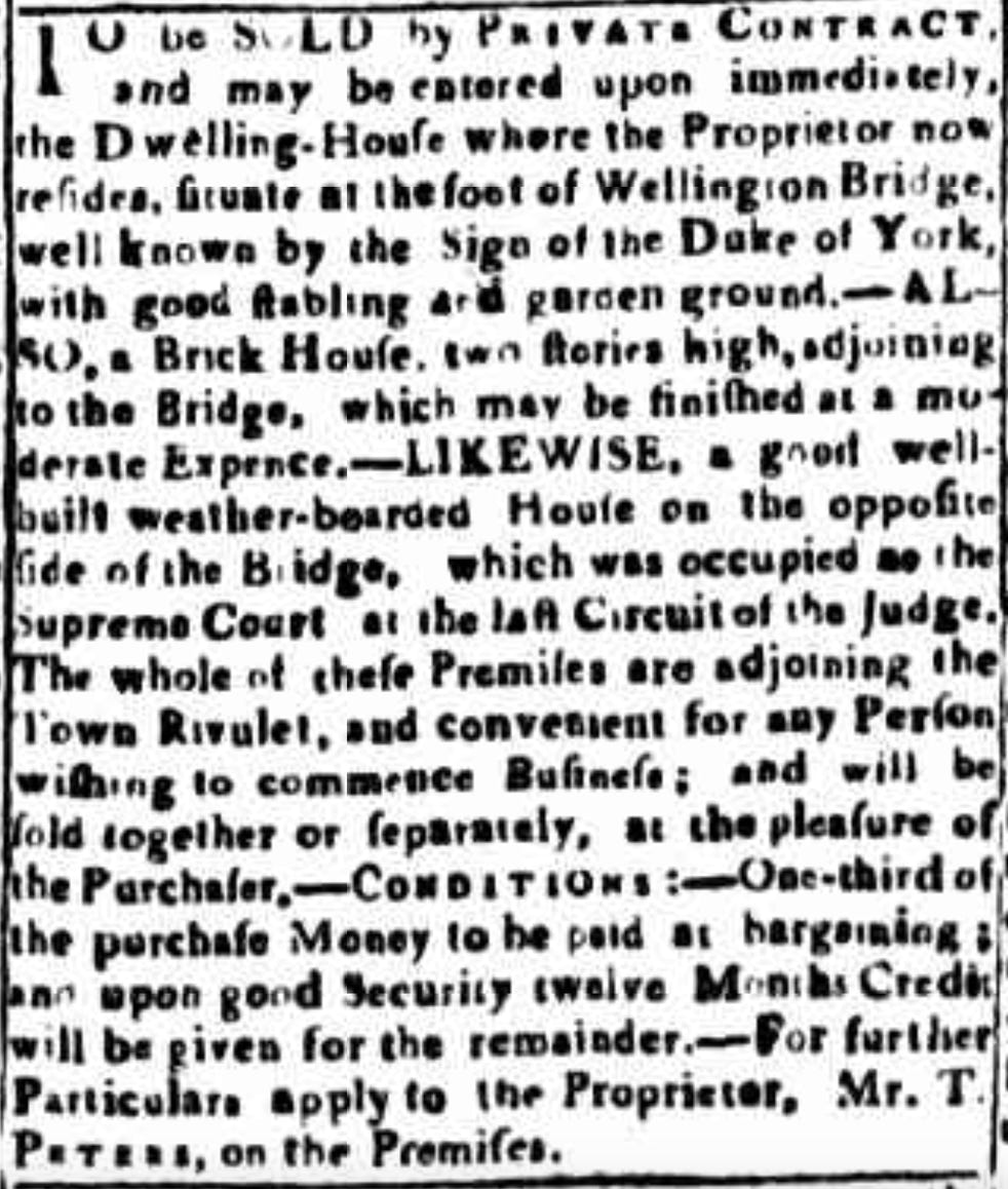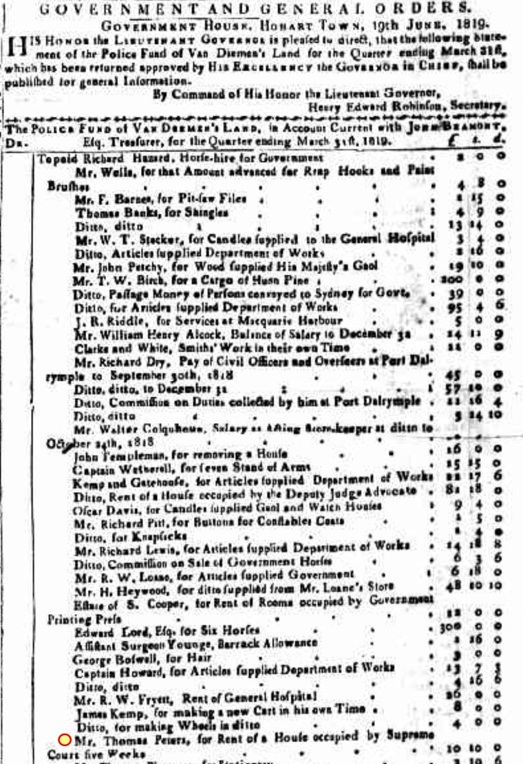 1819 began very well for Thomas Peters: “In January, 1819, the Supreme Court assembled in Hobart Town for the first time, and sat in a new house situate at the foot of wellington Bridge and rented for five weeks at a total cost of ten guineas from Thomas Peters, the owner and licensee of a public house in the vicinity known by the sign of the Duke of York.” ~ Hobart General Hospital Its Early History p.5