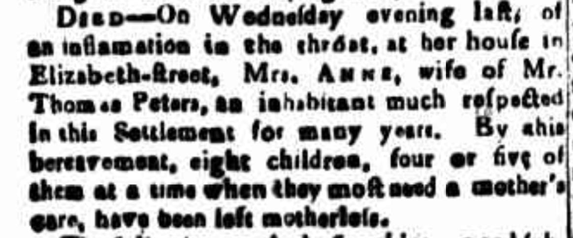 Thomas Peters was selling property and calling in debts as he prepared to move his family from Hobart Town to his new land at Bagdad. Tragedy struck on 26th May when his wife died of “an inflammation of the throat”. He was left with six children in his care: Charlotte 13, Louisa 10, Mary Ann 9, Richard 7, Sophia 4, and Anne 2. His eldest daughter Elizabeth 17 had married George (Jnr) Armytage eight months earlier. (The death notice mentions eight children but Martha had pre-deceased her mother.)