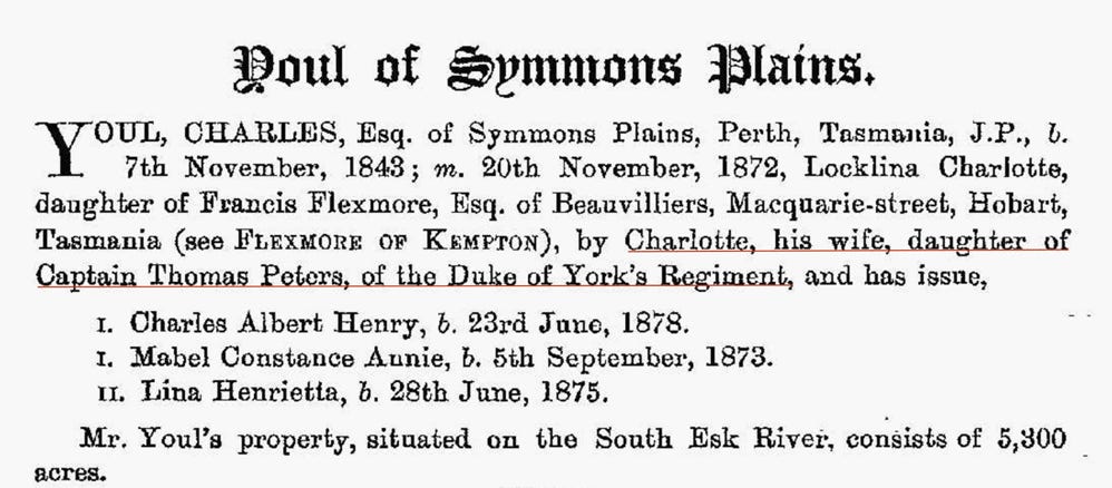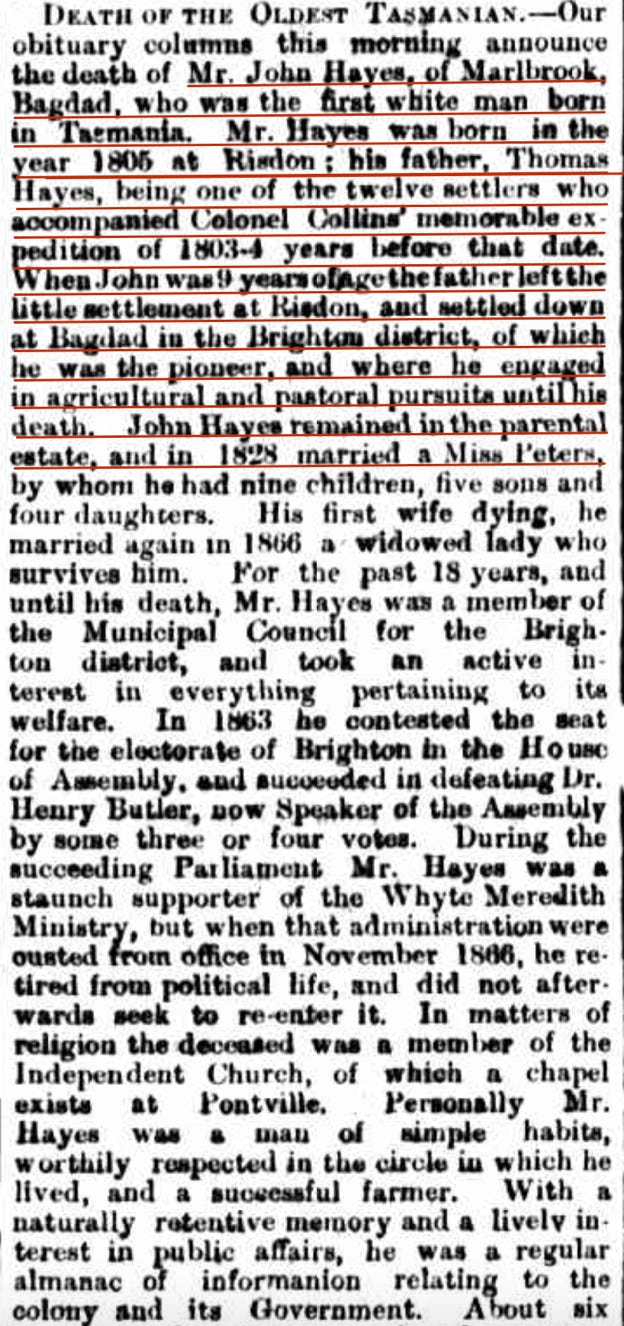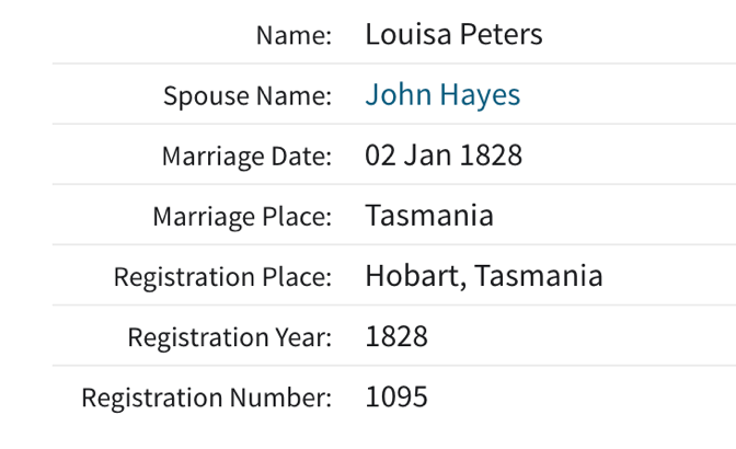 On 2nd January 1828 Louisa Peters, the 4th daughter of Thomas and Mary ‘Ann’ Peters, married John Hayes. It was ten years since her eldest sister Elizabeth had married George Armytage, (by then five of that couple’s 12 children had been born). John Hayes’ parents had been free settlers with Lieutenant-Governor David Collins' expedition. He has the distinction of being the first Free Born white male child born in Tasmania. John Hayes and Elizabeth Hayes nee Peters lived at Marlebrook, Bagdad. They had 10 children.