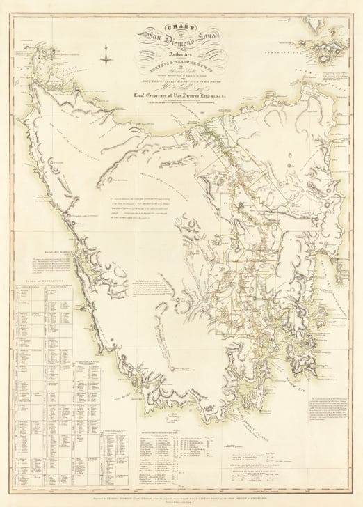SEE: Chart of Van Diemen’s Land from the best authorities and from actual surveys and measurements, by Thomas Scott Assistant Surveyor General. London, 1824.