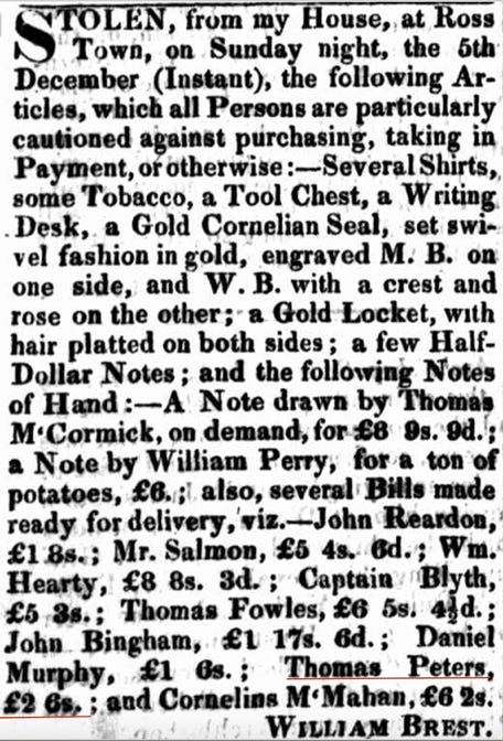 Thomas Peters was prospering around this time as he is reported to have spent almost fifty pounds at the auction of Colonel Andrew Geils’ belongings, eleven guineas was spent on seven cedar cane-bottom chairs. http://www.tasmanianaboriginal.com.au/liapootah/bowen-reconciliation.htm