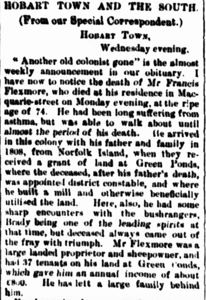 Charlotte, the 3rd daughter of Thomas and Mary ‘Ann’ Peters married Francis Flexmore Jnr. on 12th May 1829. Francis Jnr’s parents were Francis Flexmore and Elizabeth Anderson nee Bruce. Francis Snr. and Elizabeth had both been sent to Norfolk Island as convicts. They and their five children (including 7 year old Francis Jnr.), left Norfolk Island for Hobart aboard the City of Edinburgh in Sept 1808.