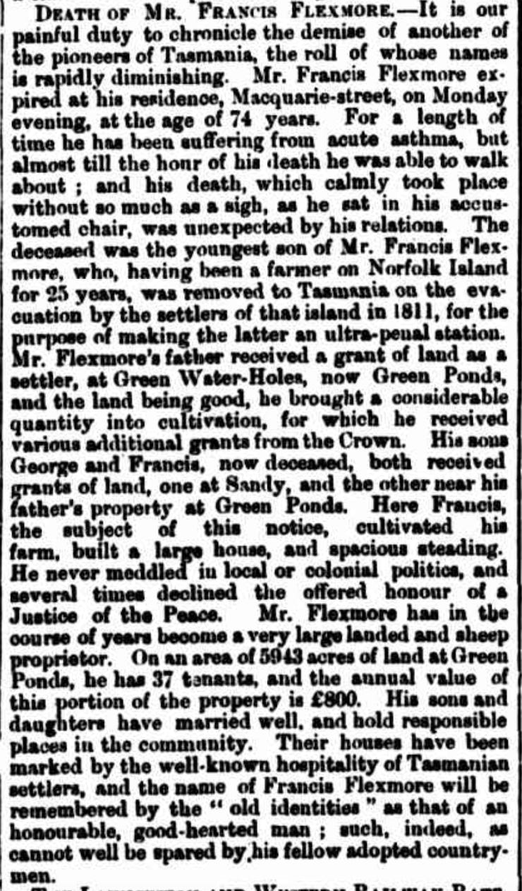 Francis Jnr. Flexmore and Charlotte Flexmore nee Peters lived at ‘Glenfern’ Green Ponds (Kempton). They had 14 children.