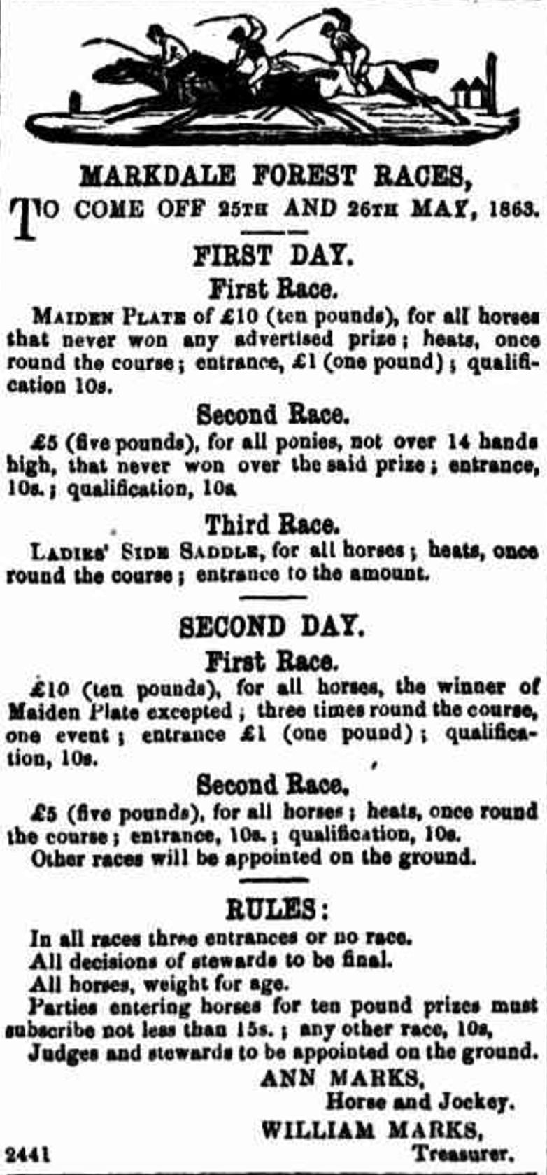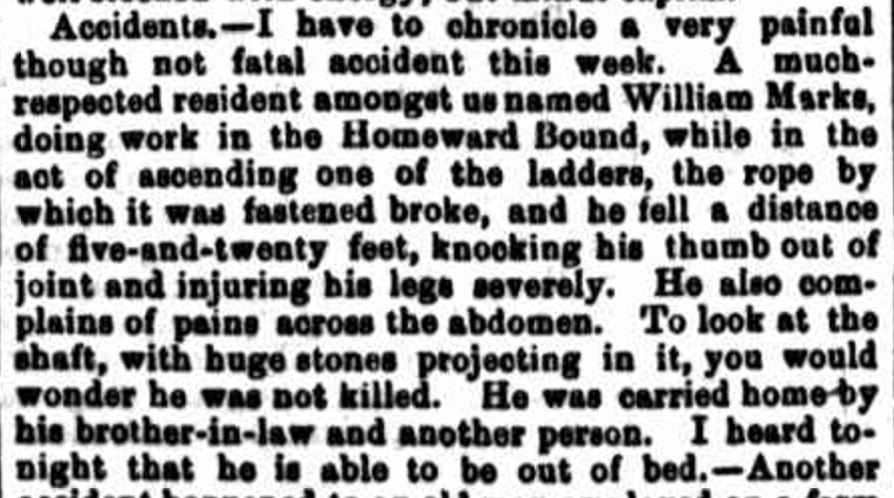 One of the oldest residents in the whole of the surrounding districts, in the person of Mrs Campbell, died on Satuday last at the residence of her son-in-law, Mr Josiah Eldridge, Lost River, at a very advanced age, being nearly eighty years old. She was the wife of the late Mr William Marks, of Markdale, so called after his name, who was killed at Binda over thirty years ago by being thrown against a tree. A large family of sons and daughters were born to them, among them being Messrs Richard, Elisha, and Alfred Marks, of Binda and Bigga, and Mrs Picker, wife of Mr William Picker, Bigga, and Mrs Eldridge, wife of Josiah Eldridge, Lost River, all of whom are well-known throughout the district. After Mr Marks' death his widow married a Mr Campbell, whom she also survived. The remains were interred in the Church of England cemetery yesterday, and were followed by a large concourse of sympathisers, the Marks family being everywhere highly respected.