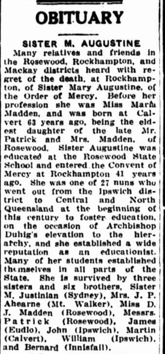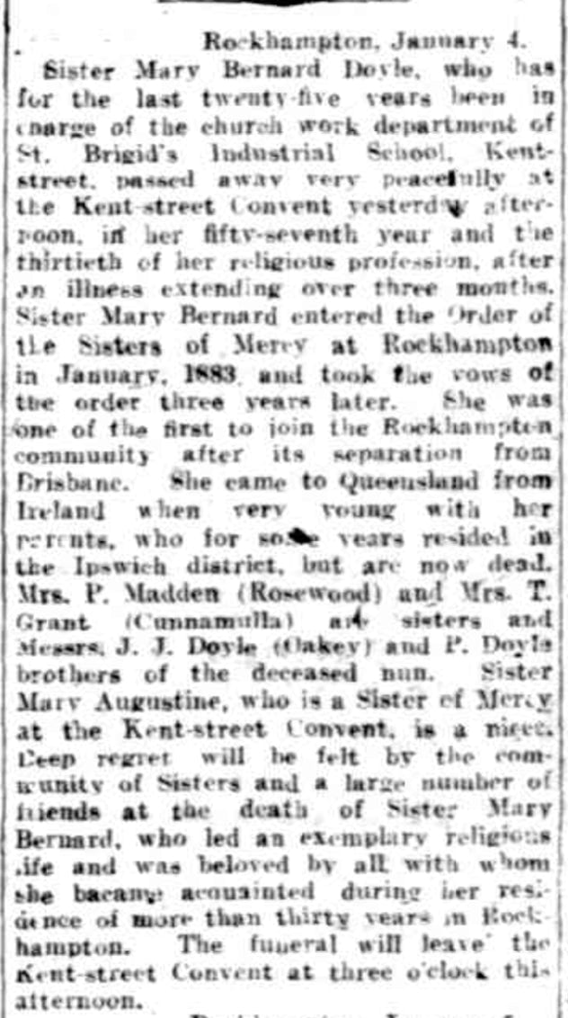 Her aunt Elizabeth Doyle, (Sister Mary Bernard), and her cousin Bridget Maria Madden (Sister Mary Augustine) were both Sisters of Mercy at the Kent St convent Rockhampton. Both of these photos were taken in the Lynn Studios, East St. Rockhampton.