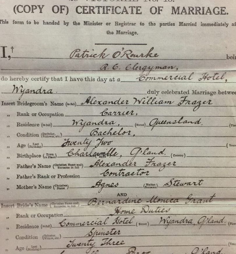 My grandfather, Alexander William (“Sonny”) Frazer, married Bernadine Monica Grant in the Commercial Hotel at Wyandra Queensland, on March 21, 1921, when he was 22 years old. The marriage was conducted by a Roman Catholic clergyman, Patrick O’Rourke.