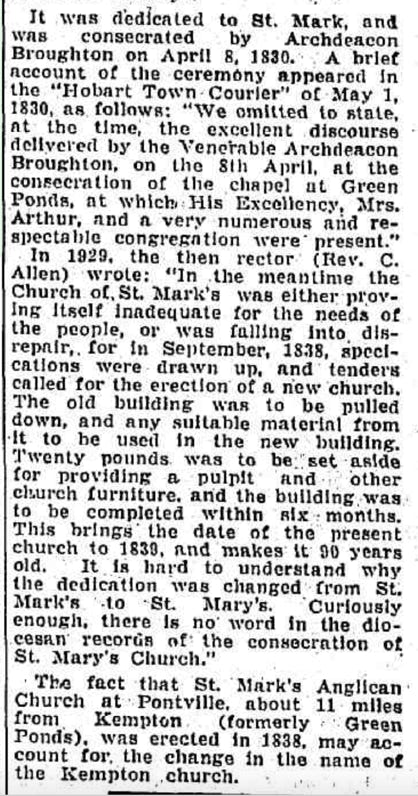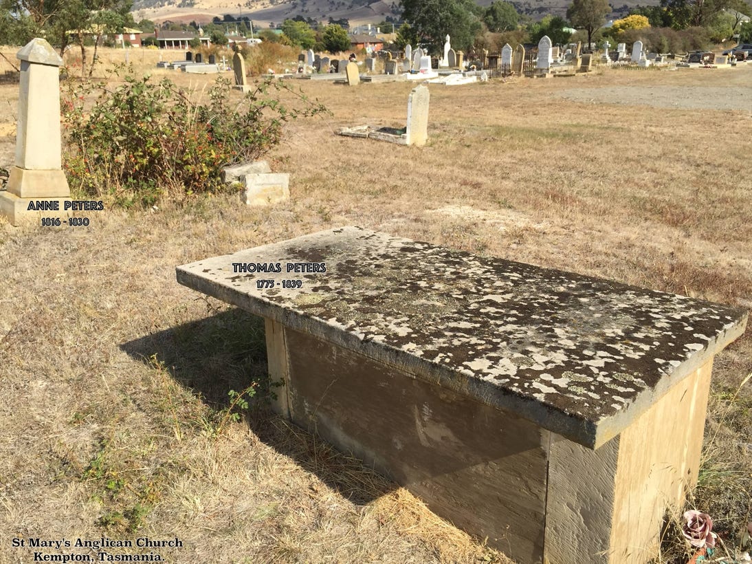 Thomas Peters died on 21st July 1839. He was 64 years old. He was buried in the cemetery at the rear of St Marks (later St Mary’s) Anglican Church at Green Ponds (now Kempton). His grave is marked by an altar tombstone and it is located close to the grave of his daughter Anne Peters. She was buried in 1830 and her grave is marked by an obelisk.