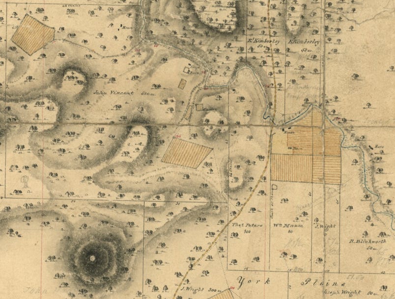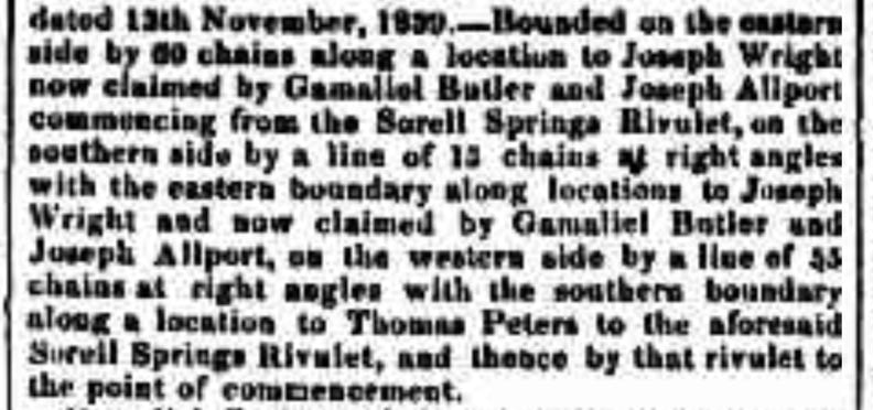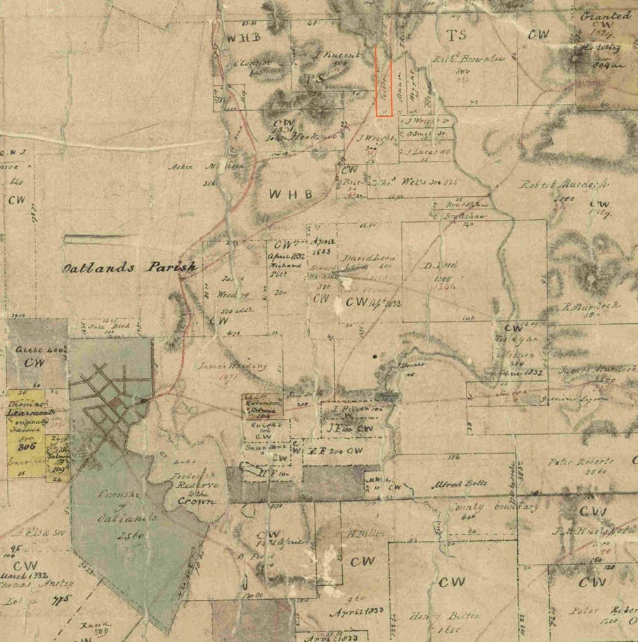 The land in York Plains that Thomas Peters was granted on 1st January 1817 is shown on both these maps. The neighbouring properties were owned by: John Vincent, Joseph Wright, William Maum and Richard Kimberley.