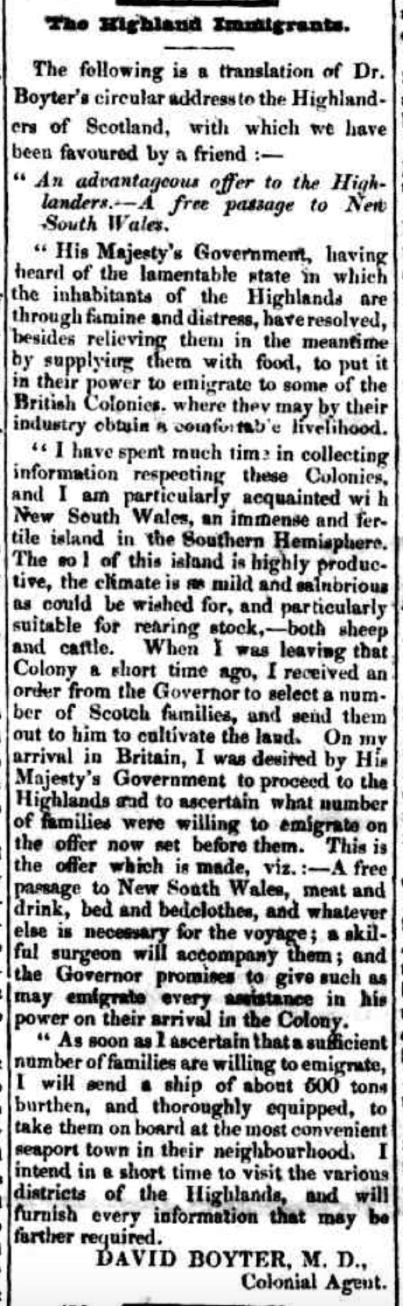 In the years 1837 to 1840, “the government-sponsored Bounty Scheme brought about 5,200 Scots emigrants, drawn mainly from destitute areas in the Highlands and Islands to Australia”. http://www.keithdash.net/Bountyships.html