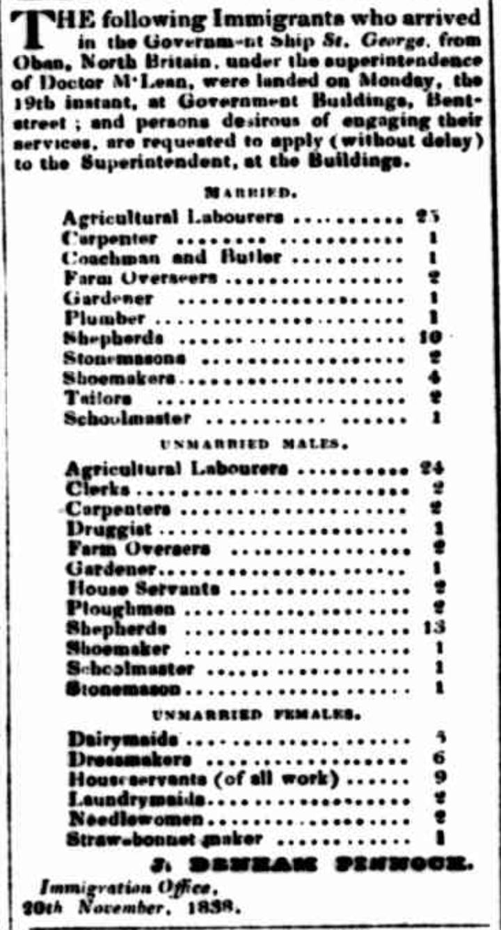 “In 1838 the flow to Australia increased, and no fewer than nine ships with 2,161 government bounty emigrants cleared from Scottish ports. In addition, 1,054 ‘private’ bounty emigrants and unassisted emigrants took passage from Scotland, making a total of 3,215 for the year. In 1839, the total number embarking in Scotland was 2,238—a seventh of the total number embarking in Britain for all the Australian settlements, including Van Diemen’s Land, Port Philip, South Australia, and Western Australia.” http://www.electricscotland.com/history/australia/scotaus3.htm