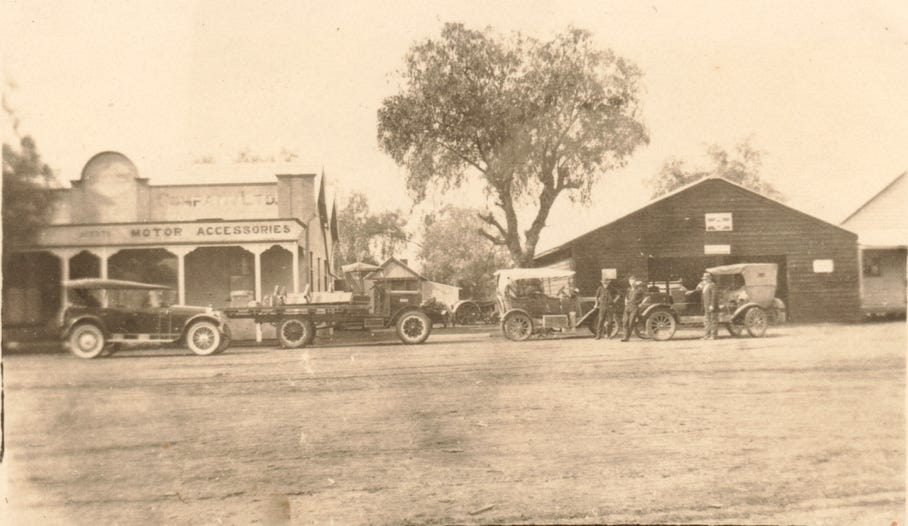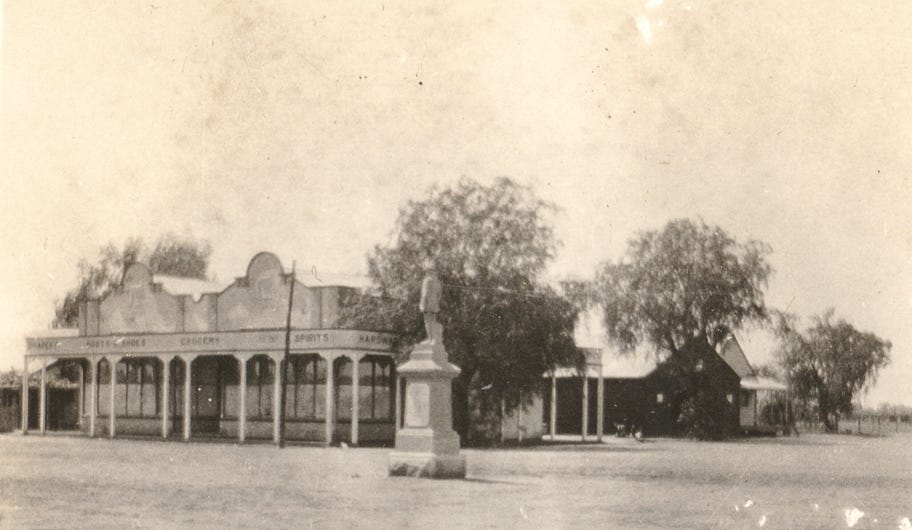 The street images are of the store and “motor garage” that was diagonally opposite the Commercial Hotel on the intersection of Mack St and Warrego St. The Wyandra War Memorial that is shown below was erected in 1921.