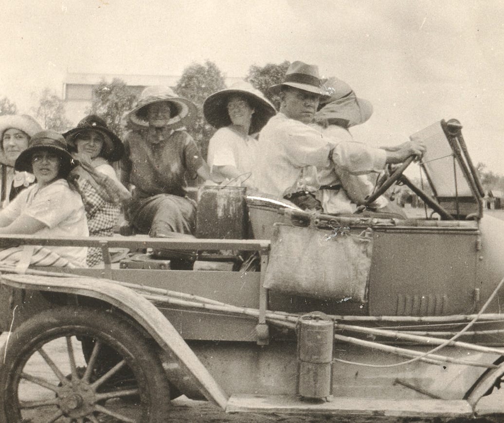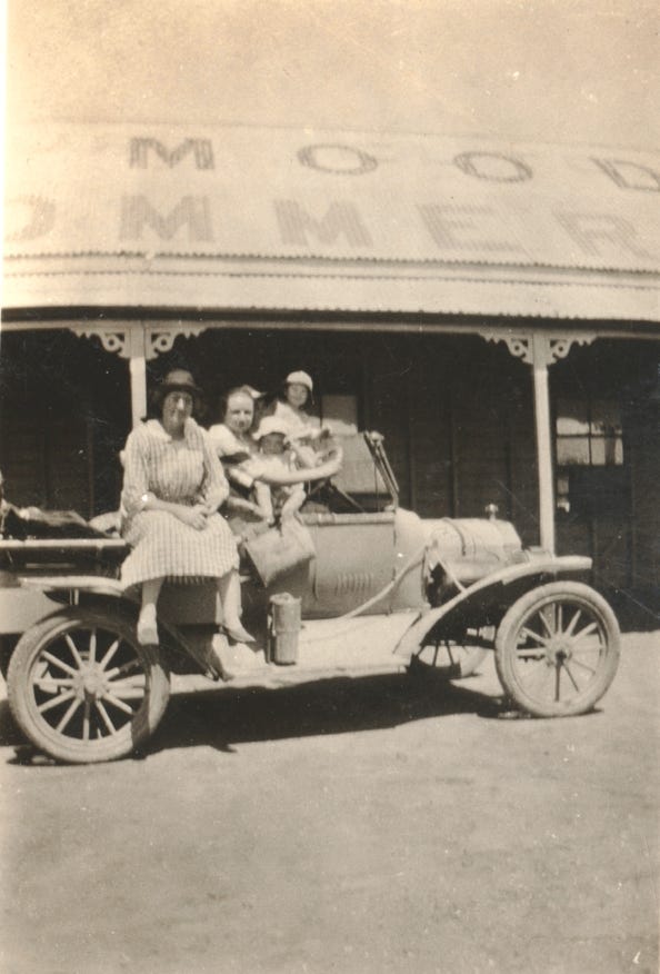 Bernadine Monica Grant married Alexander William [Sonny] Frazer in Wyandra on 21st march 1921. These photos have all been scanned are from an album that belonged to her. Thomas Henry Grant is in the middle photo and Margaret Jane Grant (nee Doyle) is seated on the rear of the car in the next photo. The children in the car would be Bernadine’s sons, ‘Lex’ and Tom. The driver for the family fishing trip in “old jigger” is Bernie’s brother Thomas Douglas Grant, (always called “Doug”).