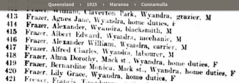 In 1925 Thomas and Margaret Grant ran the Commercial Hotel in Wyandra. Their son ‘Doug’ worked as a barman. Thomas was working again as a hairdresser. Their daughter Bernadine, now married to Alexander “Sonny” Frazer, had 2 children and was living in Wyandra. Sonny’s own family was also living in Wyandra at this time.