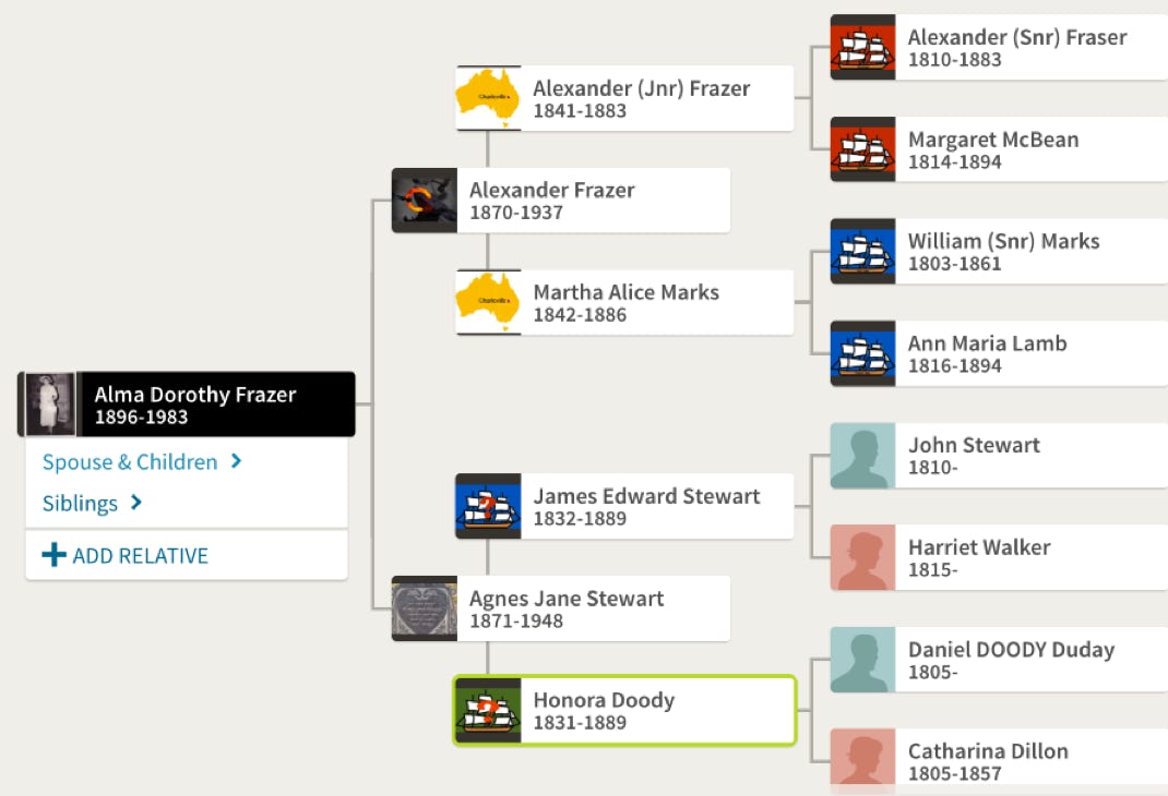 With a certificate in hand I naively assumed that the identification of the name of Agnes Stewart’s mother as Zarah was a straightforward fact. I had known Agnes’s daughters, Grace and Alma, very well as a child. Grace did all the book-keeping for the ‘Werona’ property. When I saw her name as the informant on the death certificate I thought that any details she provided would have to be accurate. I began to search for information about my great, great-grandmother believing that she was named ‘Zarah’ Doody. What I slowly discovered was that the wife of James Edward Stewart had been known by several names: Hannah, Norah/Nora and Honora. Some records even referred to her as Annie.