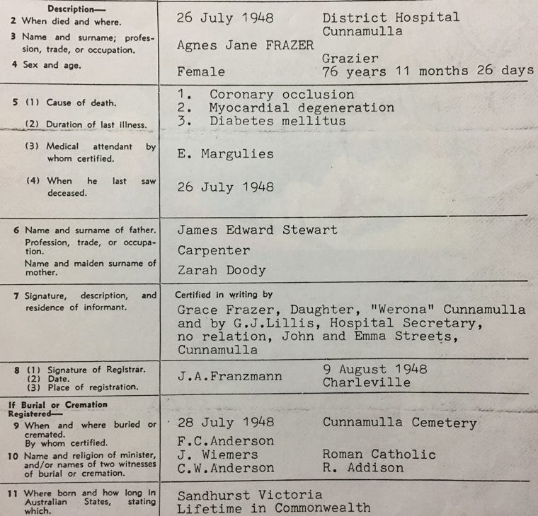 Fortunately it emerged that while my great grandma Agnes’ nephew was legally named ‘Lindsay’, not ‘Septimus’, she had a younger brother who was named Septimus. In this instance my ‘accidental’ coupling of those names proved to be helpful - once I had got all their dates sorted! The information I had was still very meagre, and Agnes Jane Frazer (nee Stewart)’s death certificate ended up being one of the small number of certificates that needed to be purchased to cast further light on the research path. The important details it provided were her parents names: James Edward Stewart and Zarah Doody.
