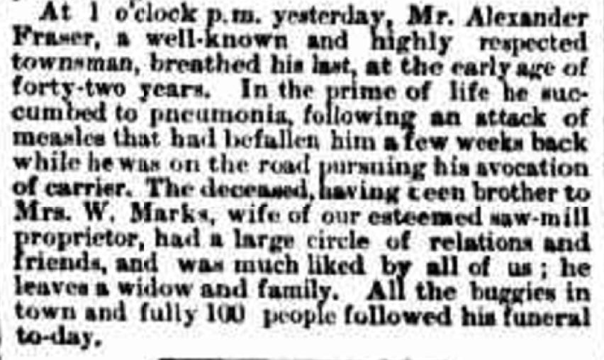 When Martha Frazer died in 1886, aged 44, her seven surviving children were orphaned. They were brought up by their aunt Elizabeth Marks (nee Frazer). Elizabeth and William Marks had 8 children of their own under 21 at that time. (When their mother died the eldest of the Frazer children, William, was 22 and the youngest, Charles, was 6.)