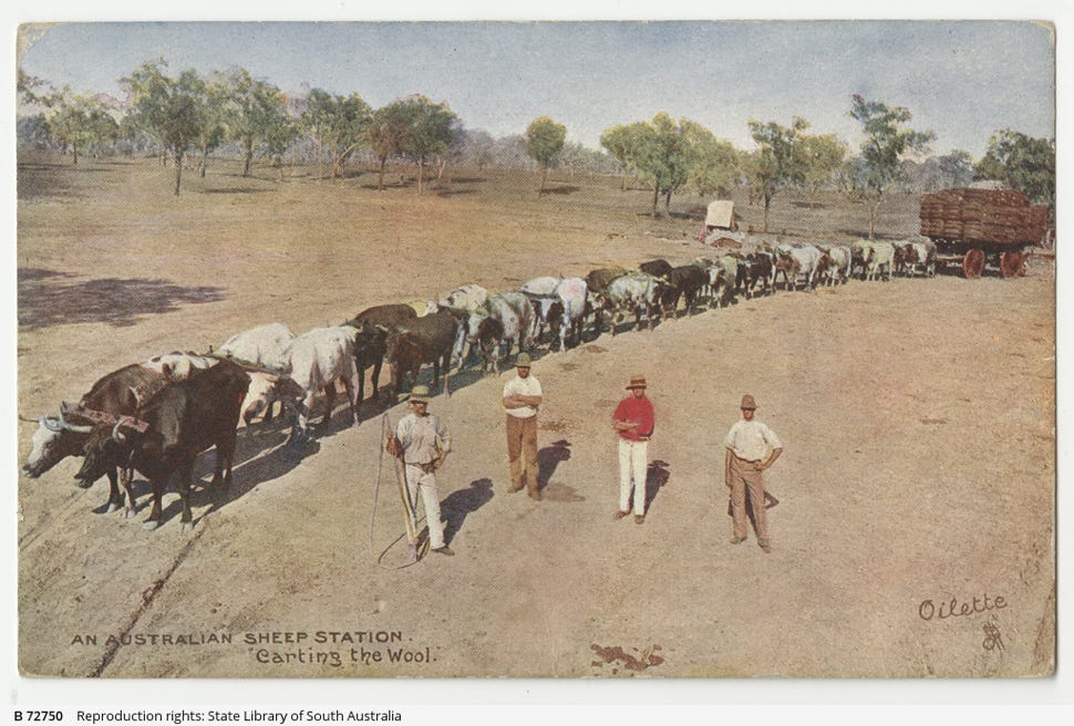 A postcard printed in England by Raphael Tuck & Sons, featuring an 'Oilette' image of a bullock team drawing 12 tons of wool.