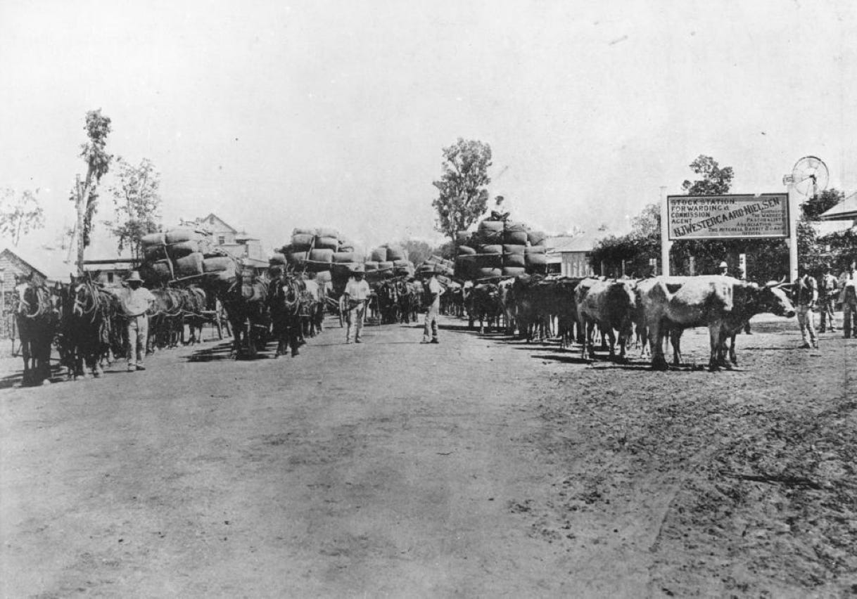 Horse and bullock teams with loads of wool bales compete for space in the street at Charleville.