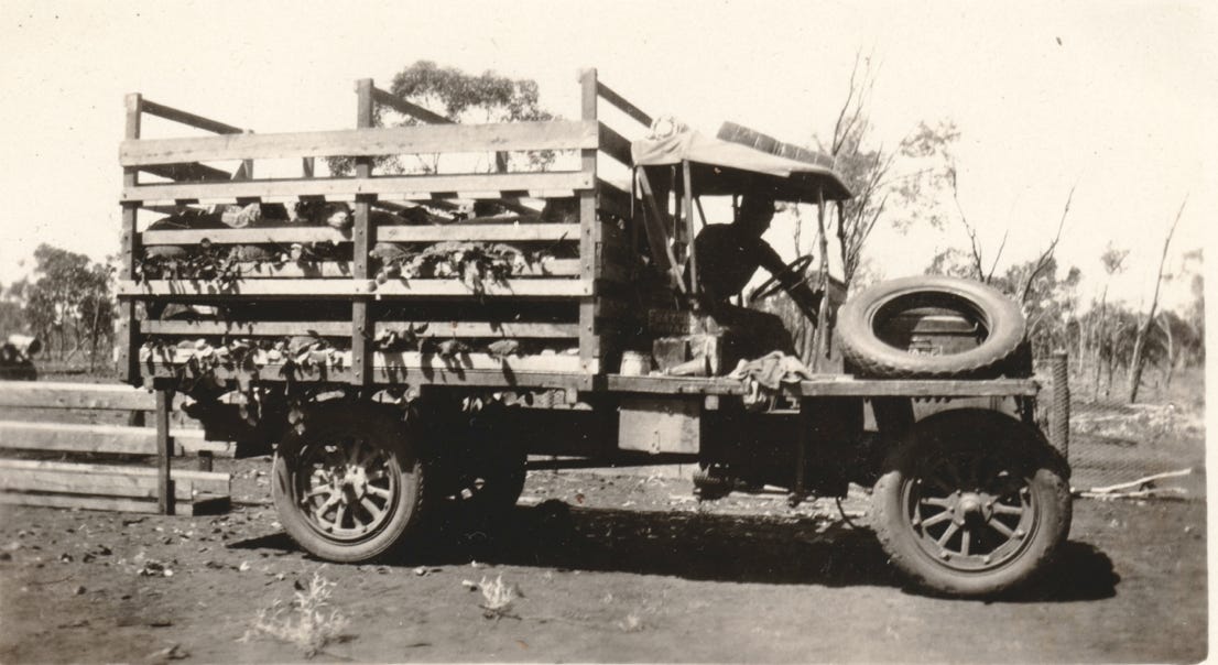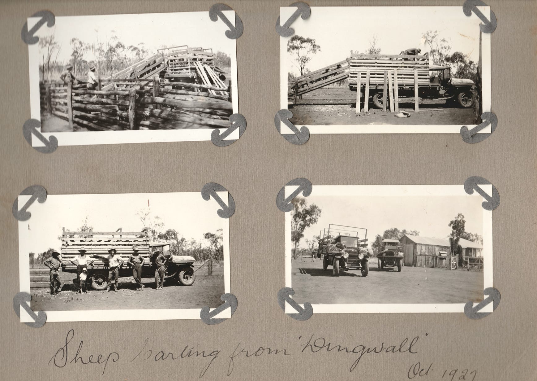 1925 -1926 was one of Qld.’s harshest droughts. Early in 1927 Thomas Henry Grant moved the family from Wyandra back to Cunnamulla. He set up a butcher shop with his son. On several occasions Thomas worked with his daughter Bernadine’s husband, “Sonny”, (Mr A.W. Frazer) to transport sheep to Cunnamulla. Bernadine photographed one of these events, and recorded it in her album. The boy in the third photograph below is probably Alexander William (“Lex”) Frazer.